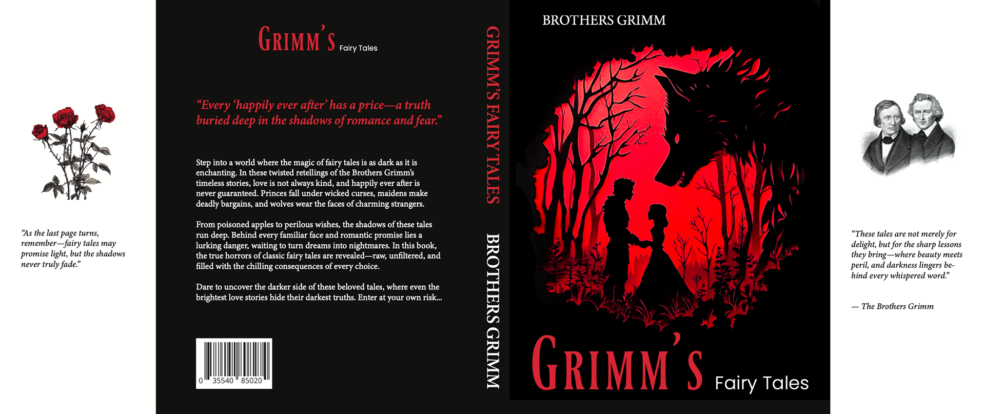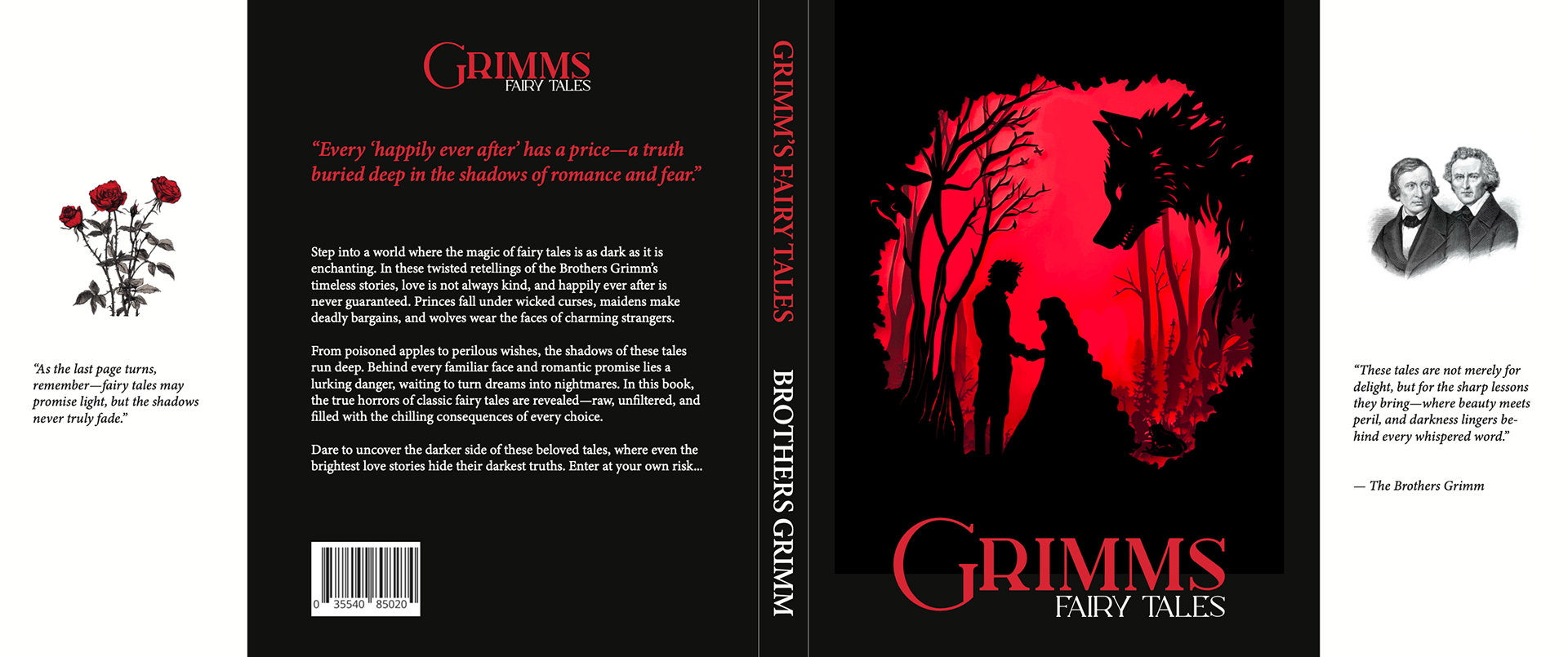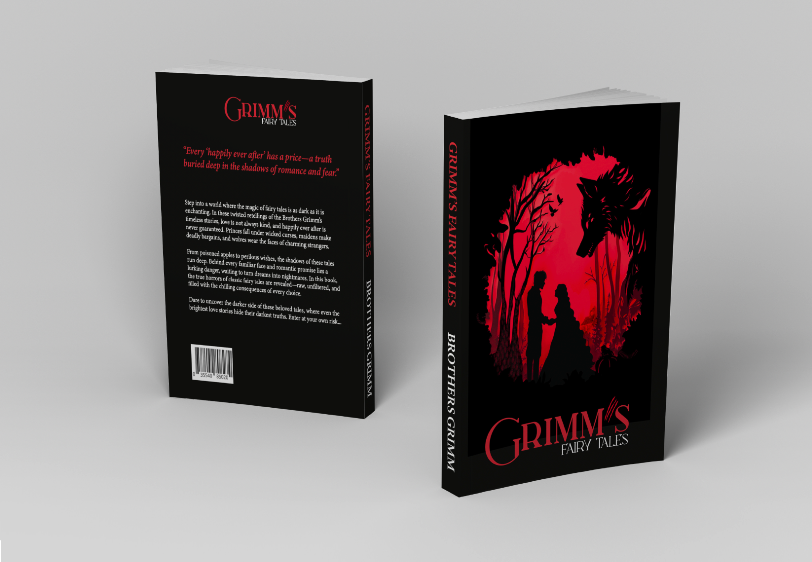 A dark, spooky book cover for Grimm's Fairy Tales, revealing the hidden darkness behind fairy tales.