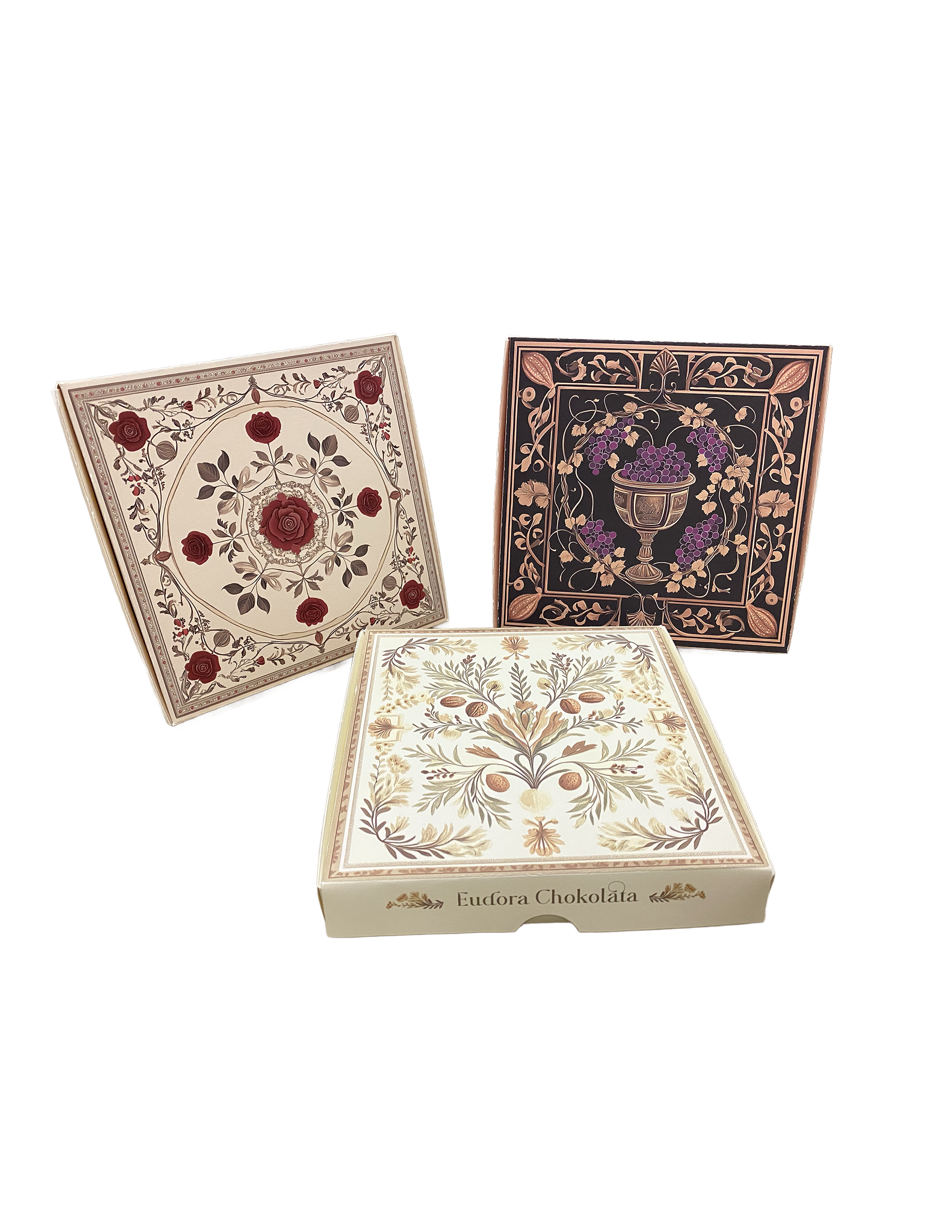 These chocolate package designs symbolize chocolate as a gift from God, with flavors inspired by three Greek deities: Love, Earth, and Wine.